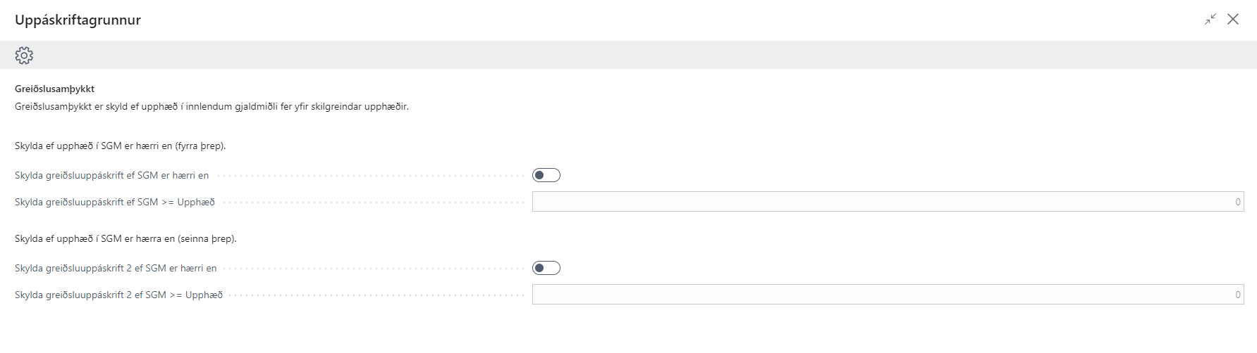 Ef valið er að greiðsluuppáskrift þá koma fleiri möguleikar sem þarf/er hægt að velja fyrir greiðslusamþykkt.