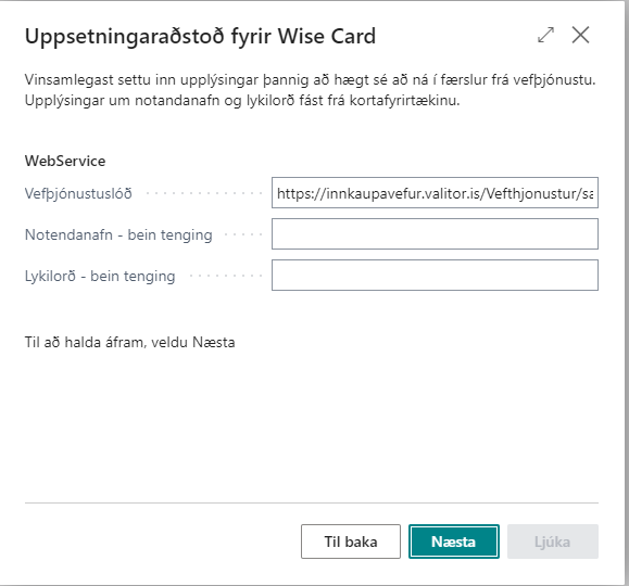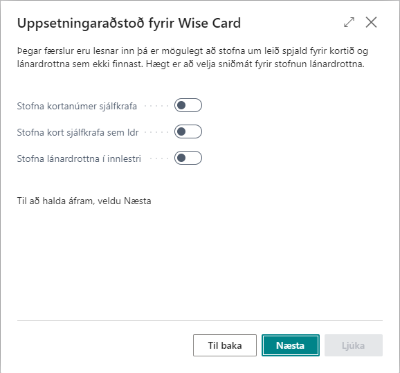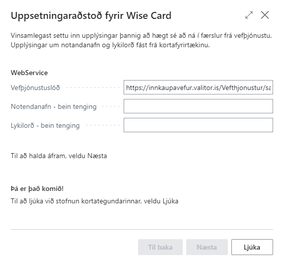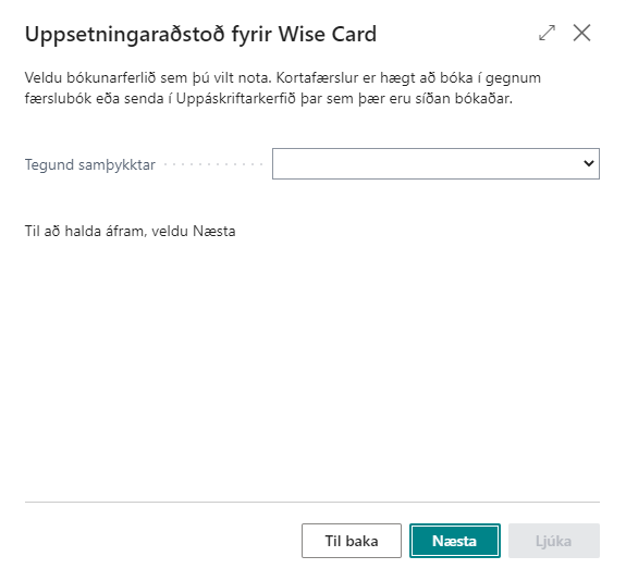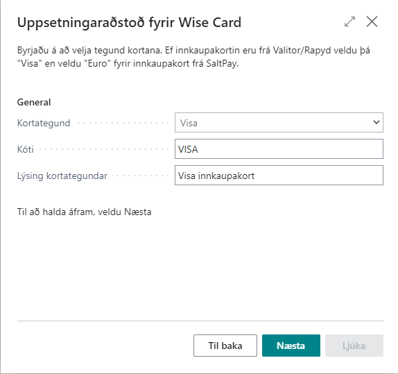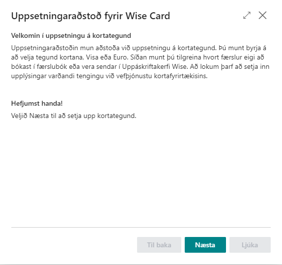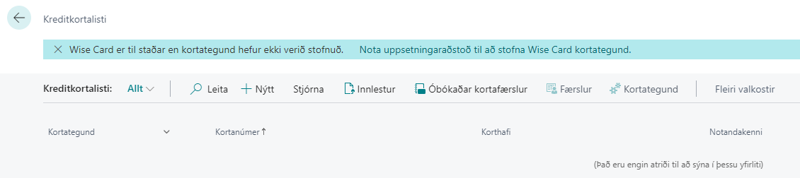 Hafi Wise card ekki verið sett upp mun kerfið láta vita þegar farið er í uppsetningu kortategunda og bjóða notanda aðstoð við uppsetningu á kerfinu. Sé smellt á Opna þá opnast uppsetningaraðstoðin.