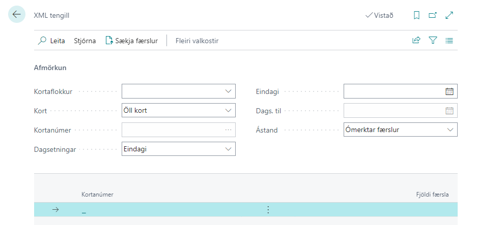 Kort | Hér er valið hvort lesa eigi inn kortafærslur fyrir öll kort eða valin kort. |