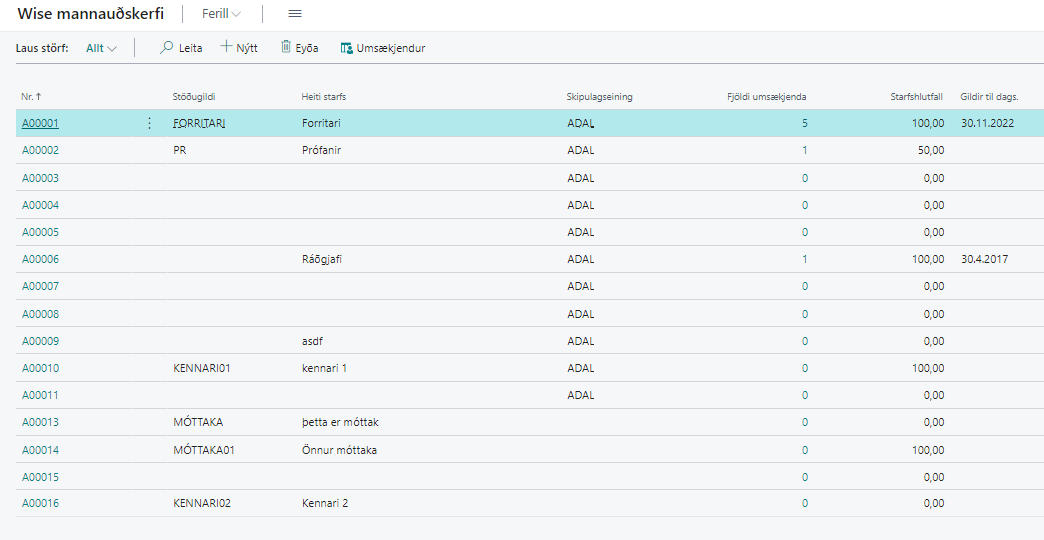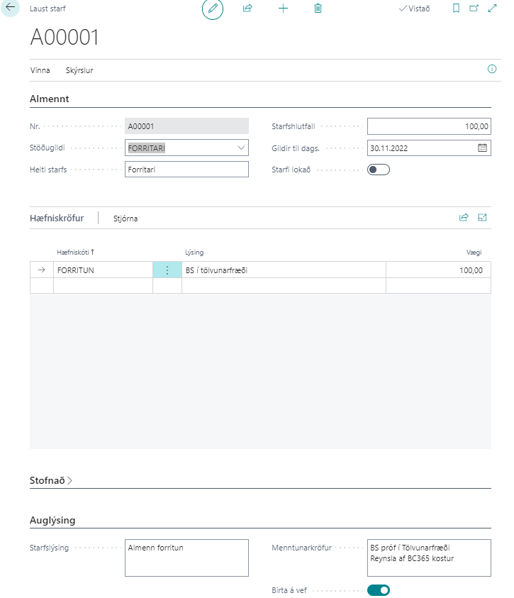 Nr. | Þegar laust starf er stofnað þá fær það sjálfgefið númer sem ekki er hægt að breyta. |