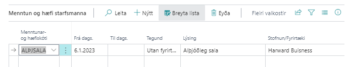 Stofnun/Fyrirtæki | Hér er skráð hjá hvaða stofnun eða fyrirtæki viðkomandi menntun og hæfi fékkst. |