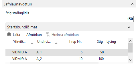 Á spjaldinu koma fram valdir þættir og samtala. Hér á myndinni fyrir ofan eru tveir þættir sem mynda stigafjölda starfs en auðvitað er þetta yfirleitt margþættara. Persónubundnir þættir eru síðan valdir inn á spjald hvers starfsmanns sem tengdur er við stöðugildið en þeir eiga þá að rökstyðja af hverju tveir starfsmenn í sama starfi hafa mishá laun. Sjá hér í næsta kafla.