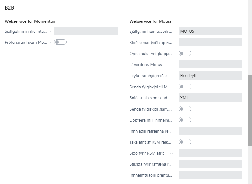 Sjálfgefinn innheimtuaðili | Hér er sett inn hvaða stilling er notuð fyrir Momentum. |