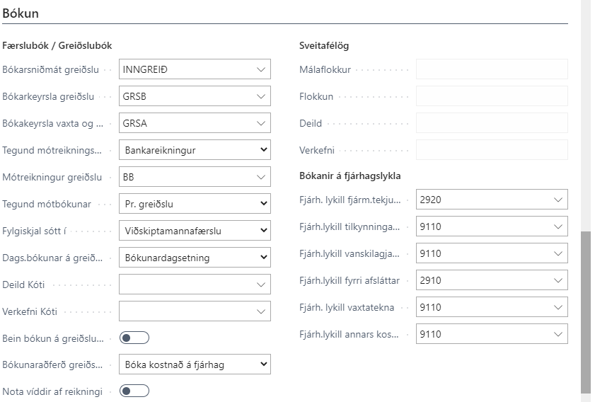 Bókarkeyrsla greiðslu | Verður að skrá. Tilgreinir hvaða bókarkeyrsla er notuð við innlestur á greiðslum í inngreiðslubók vegna greiðsluseðla. |