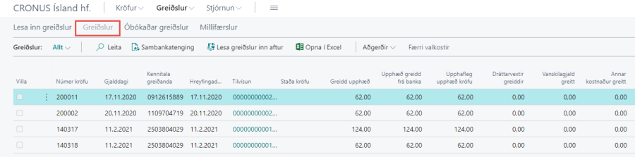 Úr aðalvalmynd Innheimtukerfisins er hægt að velja Greiðslur. Hér sækir notandi greiðsluhreyfingar í banka, greiðslur bókast beint í færslubók nema valið sé í uppsetningu á innheimtuaðila að fá þær í færslubók. Hægt er að skoða greiðsluhreyfingar fyrir innlesnar greiðslur og færslur sem enduðu á villu eða ekki af einhverjum ástæðum ekki verið bókaðar er hægt að skoða undir Óbókaðar greiðslur.
