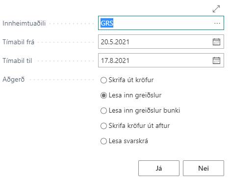 Velja þarf innheimtuaðila og tímabil. Greiðslur krafna eru nú lesnar inn og merkjast þá viðkomandi kröfur greiddar og greiðsluupphæð kemur í reitinn Upphæð greiðslu í kröfuyfirliti. Greiðslur bókast í fjárhag og jafnast á viðskiptamenn. Ef ekki hefur verið valin Bein bókun í uppsetningu verða til línur í greiðslubók (sett upp í stofngögnum) og hún er síðan prentuð og bókuð.