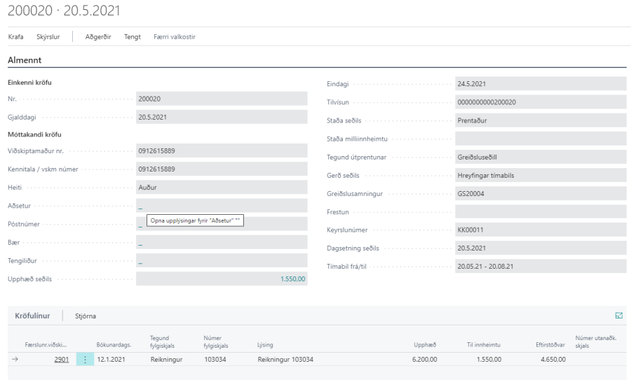 Í haus undir Almennt er hægt að finna ýtarlegar upplýsingar um kröfuna, ef farið er í kröfulínur þá er hægt að sjá t.d. hvaða fylgiskjal er á bak við kröfuna. Neðar er hægt að finna fleiri upplýsingar sem tengjast kröfunni svo sem eins og hvort hún var felld niður, farin í milliinnheimtu og fleira.