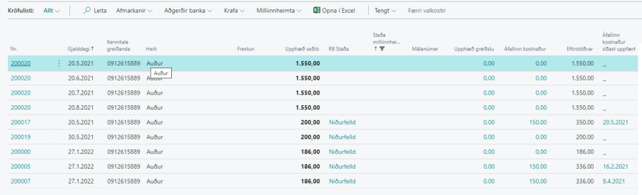 Hægra megin er hægt að sjá upplýsingar um t.d. áfallinn kostnað, en áður þarf að hafa verið búið að fara í Aðgerðir banka í Kröfulisti og Uppfæra kröfu.