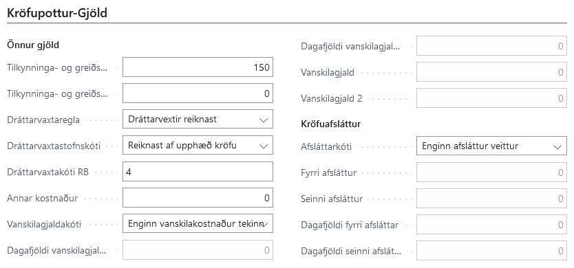 Dráttarvaxtastofnkóti | Segir til um af hvaða upphæð dráttarvextir reiknast (sjálfgefið af upphæð kröfu). |