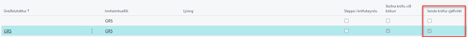 Þetta er reiturinn Senda kröfur sjálfvirkt. Það þarf að haka í þennan reit fyrir þá innheimtuaðila sem senda á sjálfvirkt í bankann.