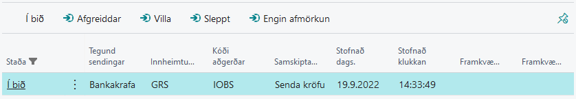 Ef kröfur fara að safnast hérna upp, bendir margt til þess að upp hafi komið villa við að senda þær í bankann og best sé að skoða verkröðina. Ef upp hefur komið villa er hægt að handvirkt senda kröfur úr þessum lista eða eyða út.