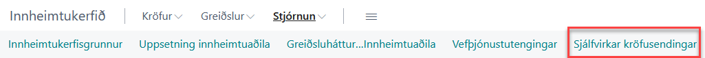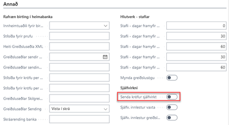 Einnig þarf að stilla ákveðinn reit í stofngögnum. Þetta er reiturinn "Senda kröfur sjálfvirkt" og er hann undir hópnum Annað.