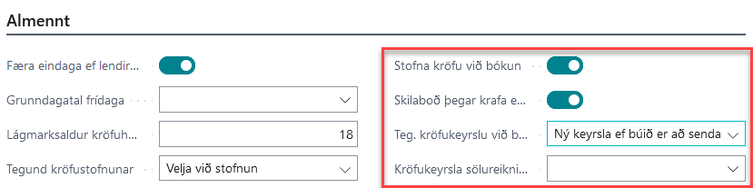 Kröfukeyrsla sölureikninga : Tilgreinir númer kröfukeyrslu sem stofna á kröfur sjálfvirkt í ef valið er Föst keyrsla í reitinn Tegund kröfukeyrslu við bókun.