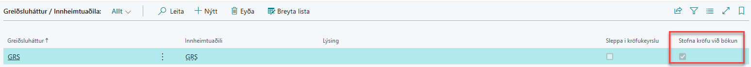 Að lokum þarf síðan að stilla í glugganum Greiðsluháttur / Innheimtuaðili að stofna eigi kröfu sjálfkrafa þegar reikningur er bókaður á þennan ákveðna greiðsluháttarkóða.