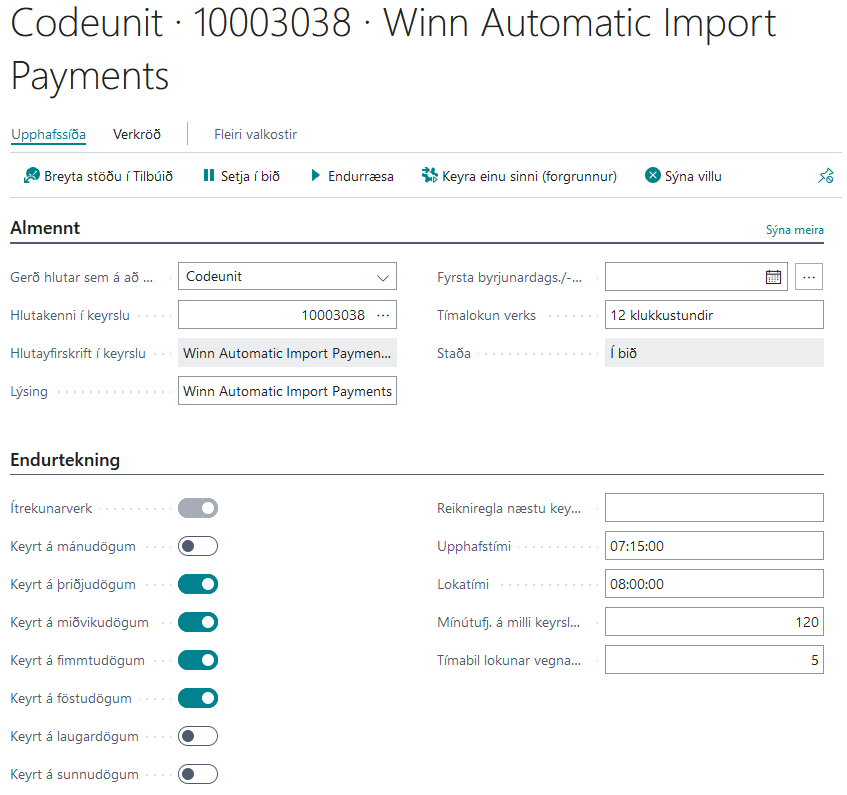 Til þess að virka þessa aðgerð þarf að skrá aðgerð 10003038 – INN Automatic Import Payments í Verkröð.