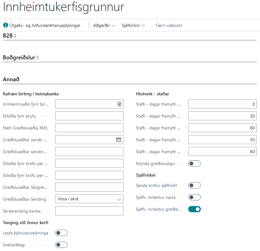 Næst þarf að merkja við ákveðinn reit í stofngögnum Innheimtukerfisins. Þetta er reiturinn Sjálfvirkur innlestur greiðsla og er undir hópnum Annað.