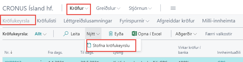 Í kröfukeyrslum er valið Nýtt > Stofna kröfukeyrslu til að stofna nýja keyrslu.