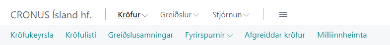 Þegar kröfur eru stofnaðar handvirkt á viðskiptamenn er farið í Kröfur í valmyndinni og því næst valið Kröfukeyrsla.