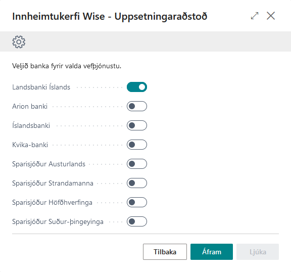 Hér þarf að velja hvaða fjármálastofnun á að tengjast með fyrsta innheimtuaðilanum.