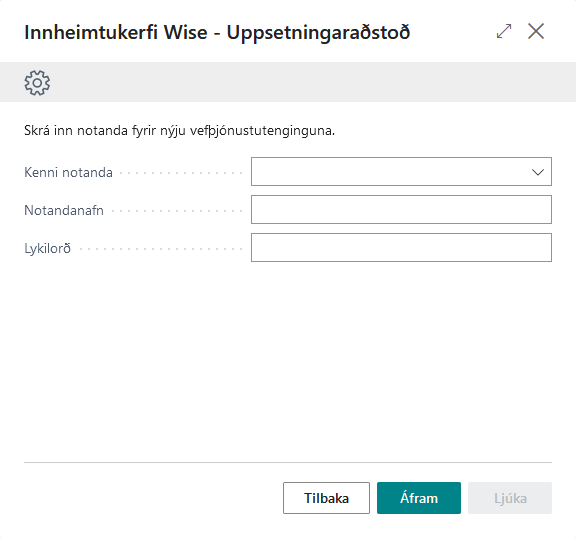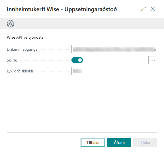 Hér þarf að skilgreina upplýsingar fyrir Wise API vefþjónustuna. Þessar upplýsingar ættir þú að fá frá Wise.