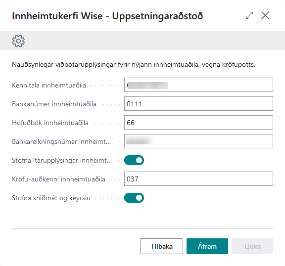 Hér þarf að slá inn ýmsar viðbótarupplýsingar fyrir innheimtuaðilann. Þessar upplýsingar ættir þú að hafa fengið frá bankanum.