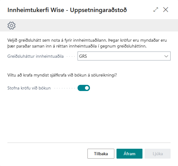 Hér þarf að velja greiðsluháttinn sem er tengdur við innheimtuaðilann. Einnig er valið hvort kröfur eigi að stofnast við bókun á reikningum.