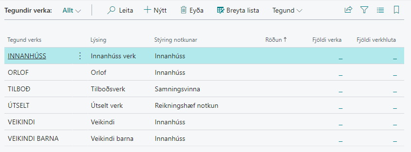 Tegundir verka stýrir því hvaða færslur sem skráðar eru á verkið verða reikningshæfar, tilheyra samningi eða eru innanhússvinna.