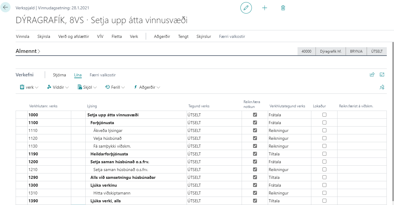 Tegund verks kemur sjálfkrafa af verkinu en hægt er að breyta henni, t.d. ef sumir verkhluter eru útseldir eftir notkun og aðrir á föstu verði eða óreikningshæfir.