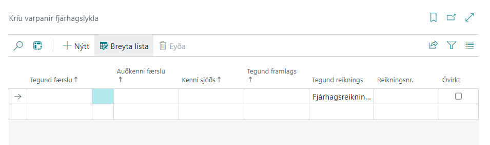 Hér eru settar upp mappanir fjárhagslykla við færslurnar svo hægt sé að flytja þær í færslubók og að þær bókist á rétta bókhaldslykla