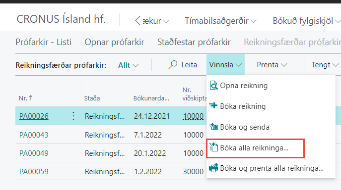 Oftast er það bókhaldið sem tekur við eftir yfirferð og bókar prófarkirnar. Í Reikningsfærðar prófarkir er hægt að bóka alla reikninga í einu eða valda. Ef valin er aðgerðin Bóka og senda fara reikningar í prentun eða tölvupóst eftir því hvernig Forstillingar skjalasendingar eru uppsettar á spjaldi viðkomandi viðskiptamanns.