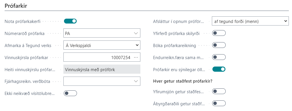 Í Verkagrunni þarf að virkja notkun á prófarkakerfi og fara yfir valmöguleikana sem þar koma fram.