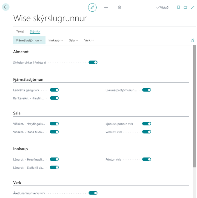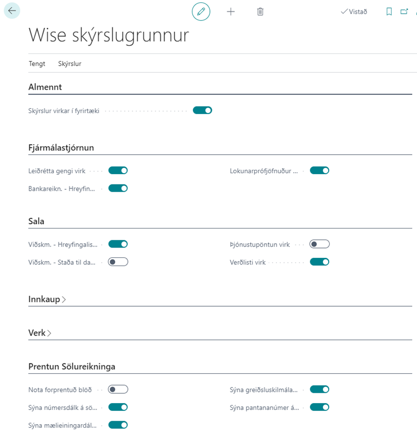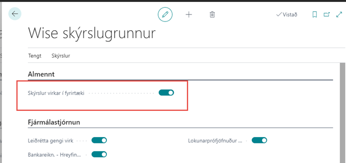 Ef hakað er við reitinn Skýrslur virkar í fyrirtæki þá virkjast allar Wise skýrslur. Hér er einnig hægt að haka við skýrslu eða taka hakið af allt eftir hvort nota eigi Wise skýrslu eða staðlaða skýrslu.
