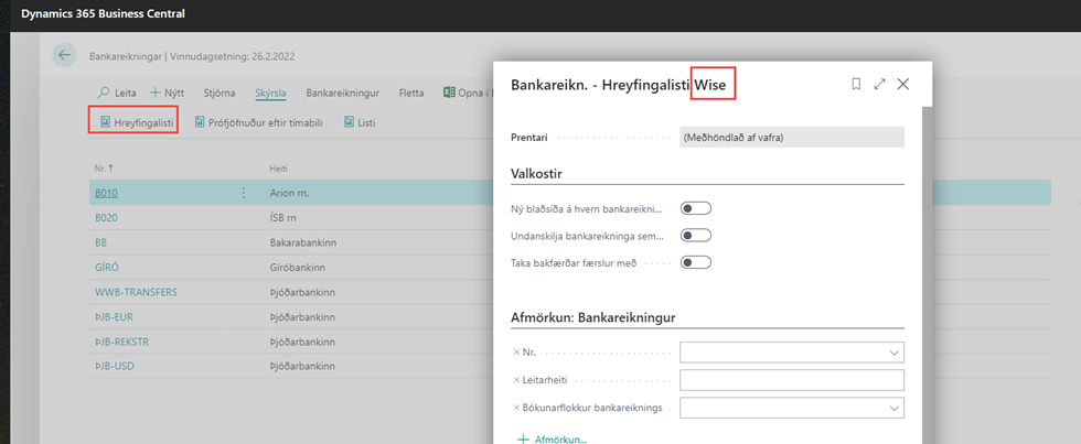Ef farið er í Wise skýrslugrunn er hægt að velja skýrslur sem útbúnar hafa verið af Wise í stað þess að nota staðlaðar skýrslur frá Microsoft.