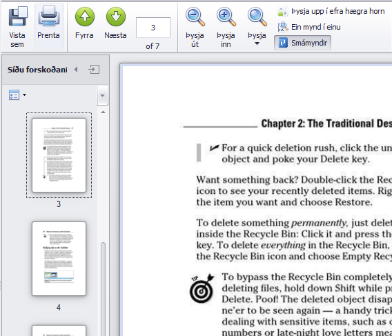 Ef hnappurinn Smámyndir er virkjaður þá birtist forskoðun á heildar PDF skjalinu vinstra megin við forskoðunargluggann.