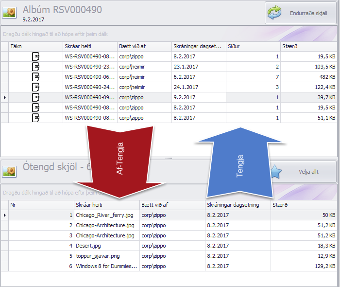 Nú er hægt að draga skjöl á milli tengdu og ótengdu listanna á öllum tegundum af sýnum, Rúðusýn, Skráarsafnssýn og Albúmasýn. Einnig er hægt að draga utanaðkomandi skjöl beint úr File Explorer, tölvupósti eða hverju sem er í hvort sem er tengda listann eða ótengda listann.