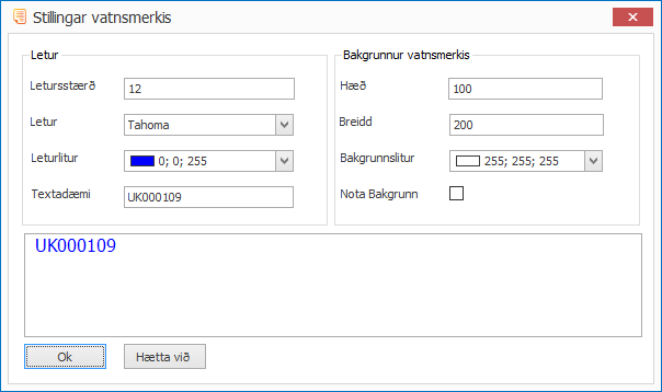 Breidd - Breiddin á kassanum utan um vatnsmerkið. Ef textinn kemur í tveimur línum er hægt að auka breiddina svo að hann komist í eina línu.