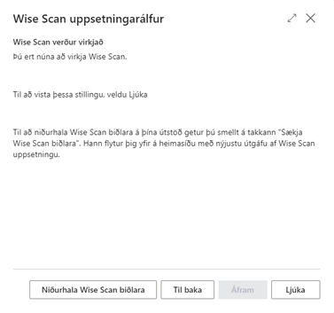 Til að sækja Wise Scan biðlara og setja upp á útstöð þarf að smella á hnappinn Niðurhala Wise Scan biðlara og nota Setup skrána til að setja upp á útstöð (þín vél). Þá hefur Wise Scan verið virkjað. Veljið Ljúka.